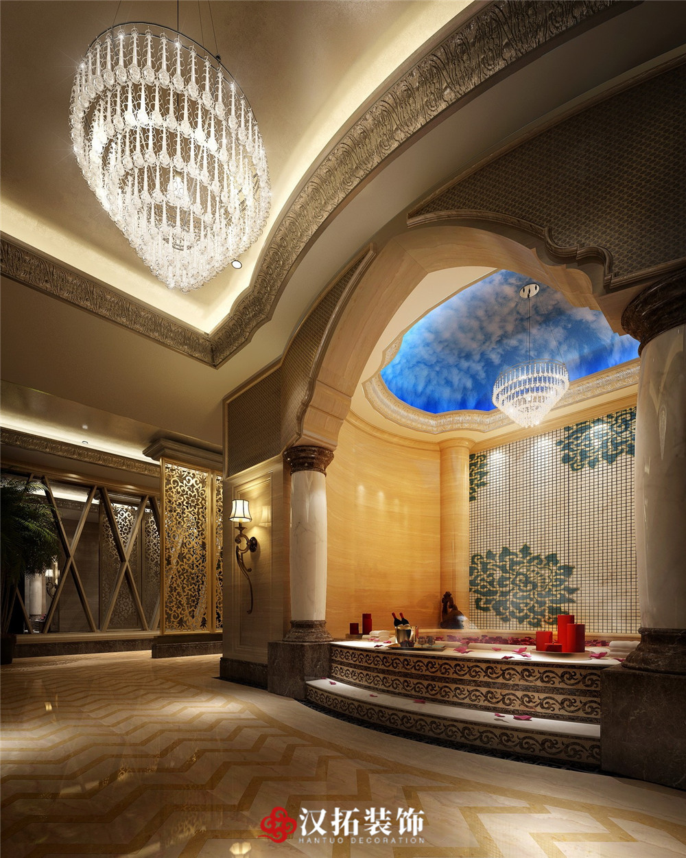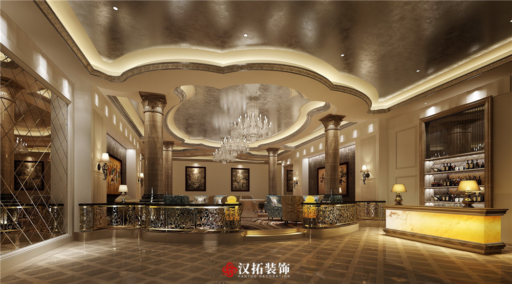 設(shè)計說明:將傳統(tǒng)元素與現(xiàn)代藝術(shù)表達完美統(tǒng)一,打造出舒適雅致的休閑場所。和諧的色彩搭配結(jié)合燈光設(shè)計,金屬質(zhì)感的材質(zhì)和精致的紋路的演繹,在凸顯典雅氣質(zhì)的同時,給人放松、自在的休閑空間,暢享人生之悅。