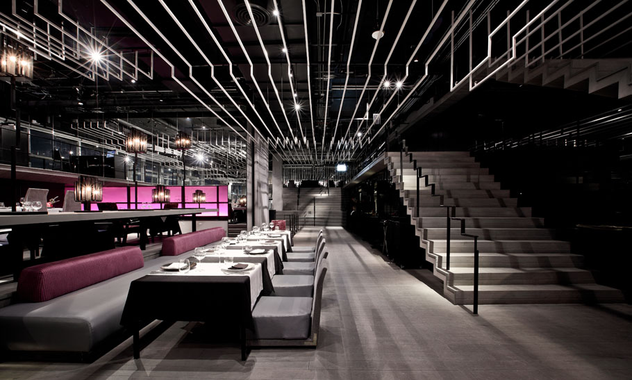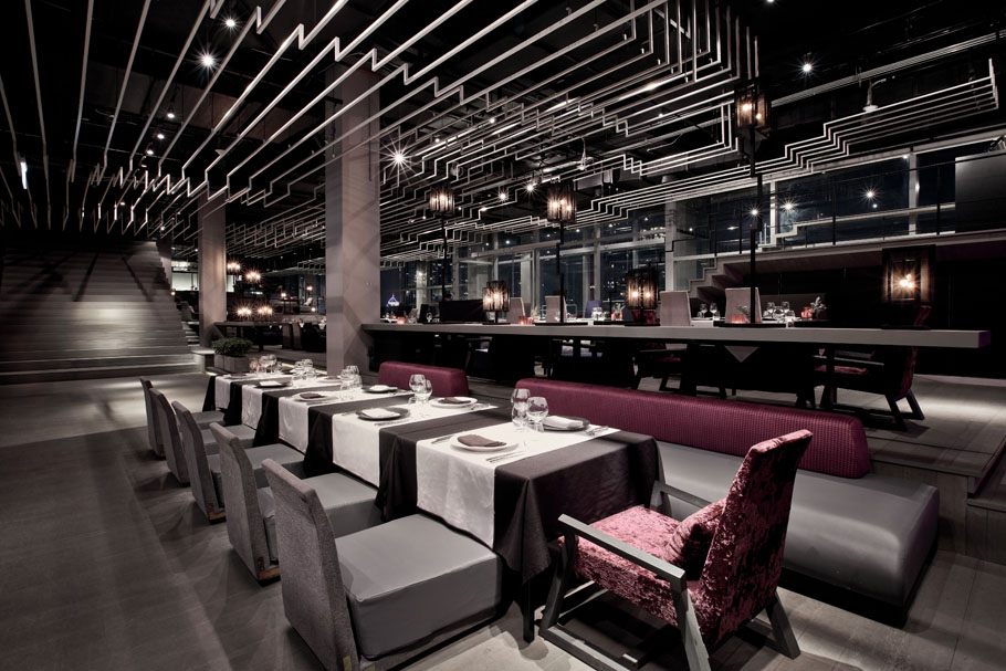 設計說明:波折線這個元素被頻繁的使用在空間中,樓梯,欄桿,座位,舞臺,燈飾,天花都有。天花上用的是波折的細鋼絲線,這些線條擋住了天花上的設備,并連同其它要素將空間變得活力,流動。室外的用餐涼亭也使用到波折線元素,其成為了空間內美麗天際線的獨特相框。時尚的元素,家具,裝修,圖案,讓這里充滿吸引力。