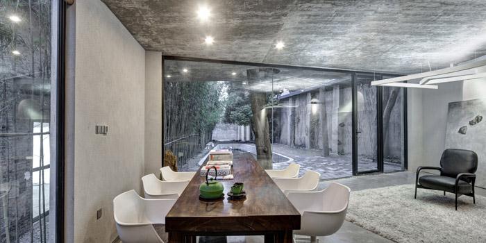 設(shè)計(jì)說明:基地本身極為局促,三向面墻,只有一個(gè)方向朝向一個(gè)有水池的后院,同時(shí)整個(gè)建筑對空間的索取也因?yàn)楝F(xiàn)有的一顆大樹而受到很大限制,而設(shè)計(jì)的結(jié)果也表現(xiàn)為一種綜合了封閉與開敞、占有與妥協(xié)、趣味空間與邏輯建造等多種復(fù)雜關(guān)系之后的一種和諧。整個(gè)建筑貼合基地空間,平面布局呈現(xiàn)為一個(gè)邏輯關(guān)系模糊的四邊形,卻也因此獲得了對空間的最大索取。整個(gè)建筑在布局上分為三部分,朝向后院一側(cè)布置相對公共性的開敞空間,一層茶室,二層圖書室,同時(shí)在二層圖書室伸出一個(gè)三角型的小平臺(tái)將現(xiàn)存樹木加以包裹,使得樹木和建筑本身融為一體。而背向后院一側(cè)布置