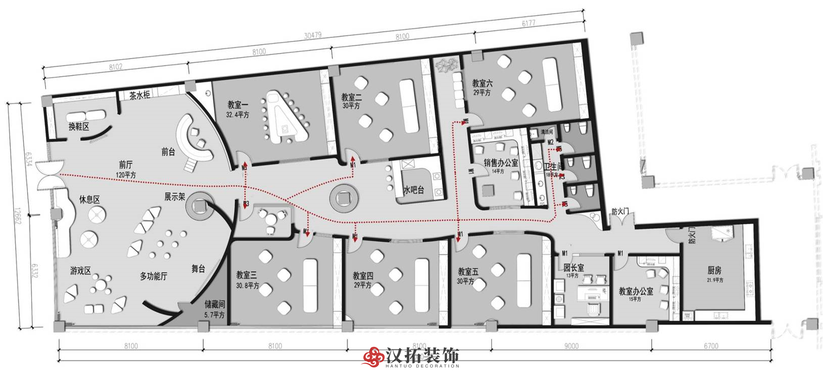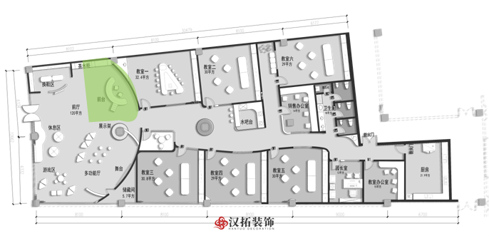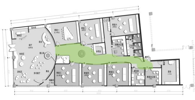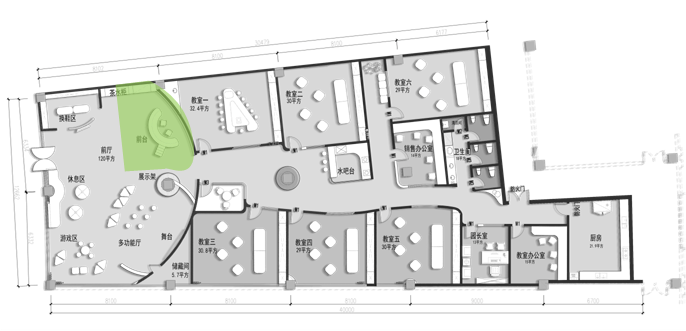 前廳120平,增加小舞臺(tái)區(qū),家長(zhǎng)或路過(guò)的群眾在門外就能看到園方的兒童或親子表演,增加人氣。我們把通道做成異形,擯棄傳統(tǒng)的方正規(guī)矩,顯得格外與眾不同,因?yàn)槭强偟?,?duì)空間是有一定要求的,一定要做到與其他園區(qū)的差異性,對(duì)品牌宣傳,對(duì)招生都是有利的。這點(diǎn)園長(zhǎng)也非常認(rèn)同我們,最終達(dá)成一致的合作意向。