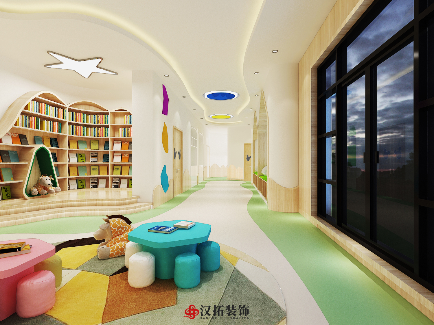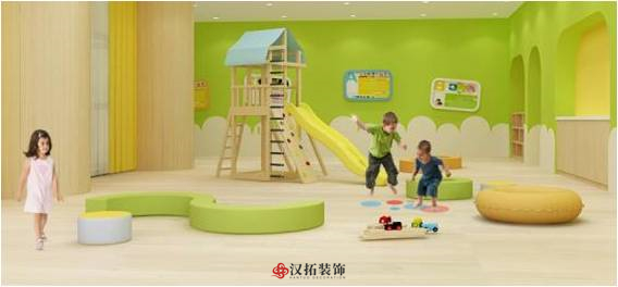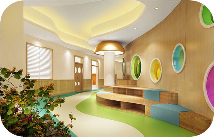 過(guò)道的設(shè)計(jì)突破傳統(tǒng),異形空間,給孩子神秘感,蜿蜒曲折讓孩子的探秘童心迸發(fā)出來(lái),地面地膠與頂面石膏板吊頂造型協(xié)調(diào)統(tǒng)一,使不規(guī)則的空間也顯得錯(cuò)落有致。