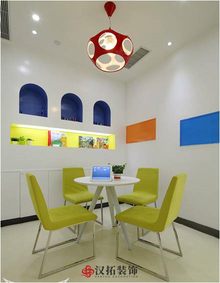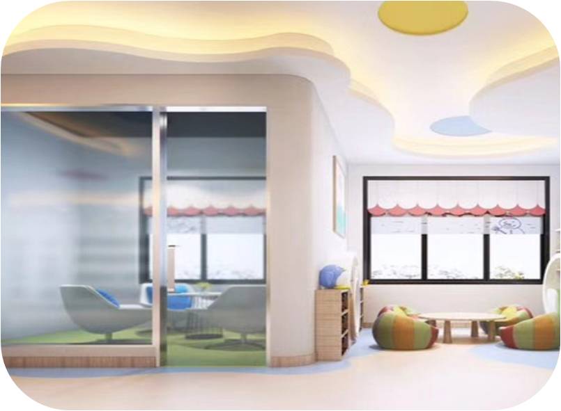 咨詢室靠近前廳及教室,家長(zhǎng)咨詢時(shí)能看到前廳的動(dòng)態(tài)以及校區(qū)內(nèi)孩子的狀態(tài),加上隔墻用透明鋼化玻璃,能夠觀察到全局,給家長(zhǎng)很好的視覺(jué)效果,我們建議不用或少用玻璃,在孩子夠得到的地方使用玻璃時(shí)建議做防爆玻璃。