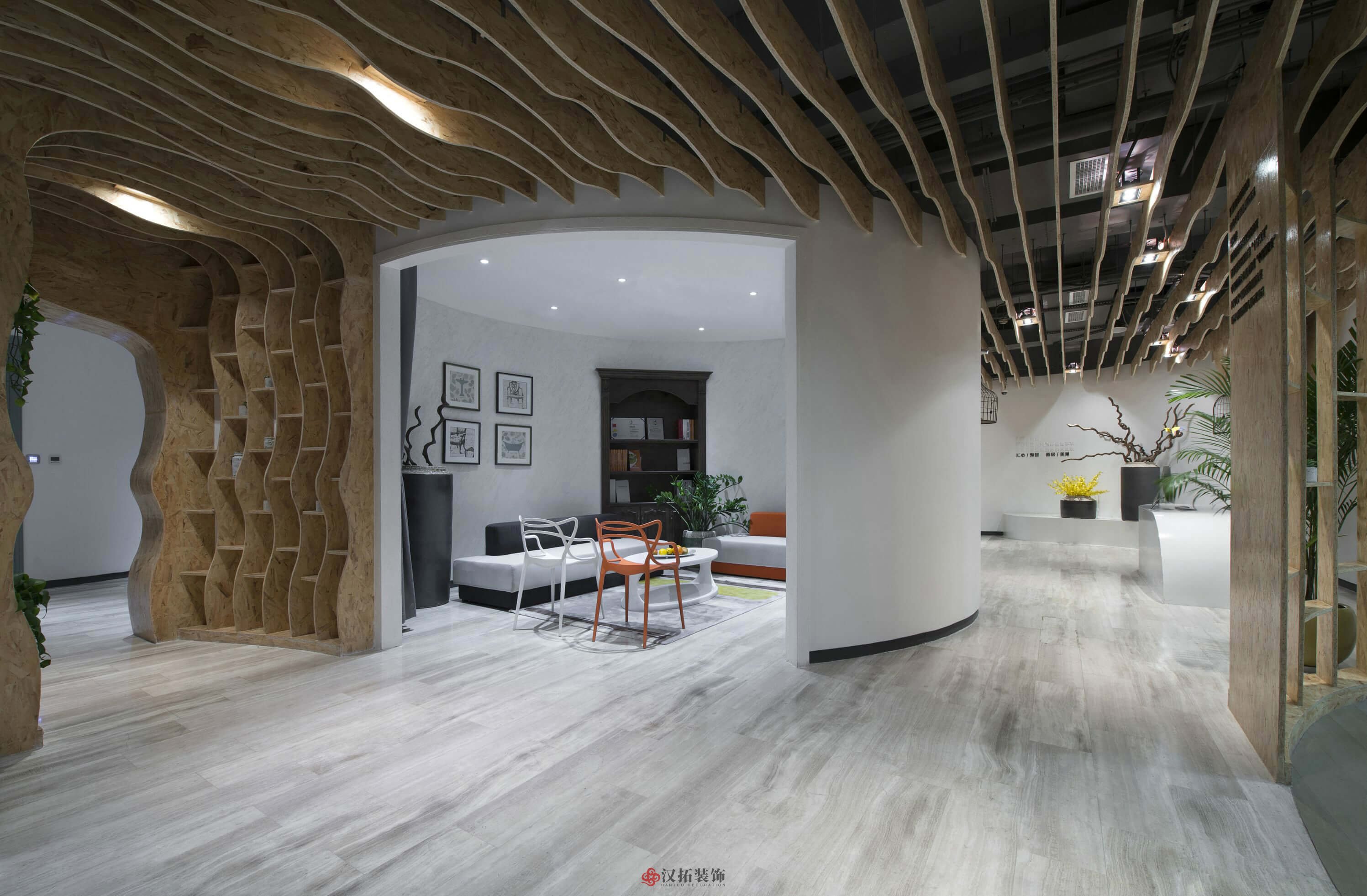 設(shè)計(jì)說(shuō)明:本設(shè)計(jì)運(yùn)用新中式的設(shè)計(jì)風(fēng)格,多用弧形隔斷,整體設(shè)計(jì)成樹(shù)洞模樣,比較新穎。