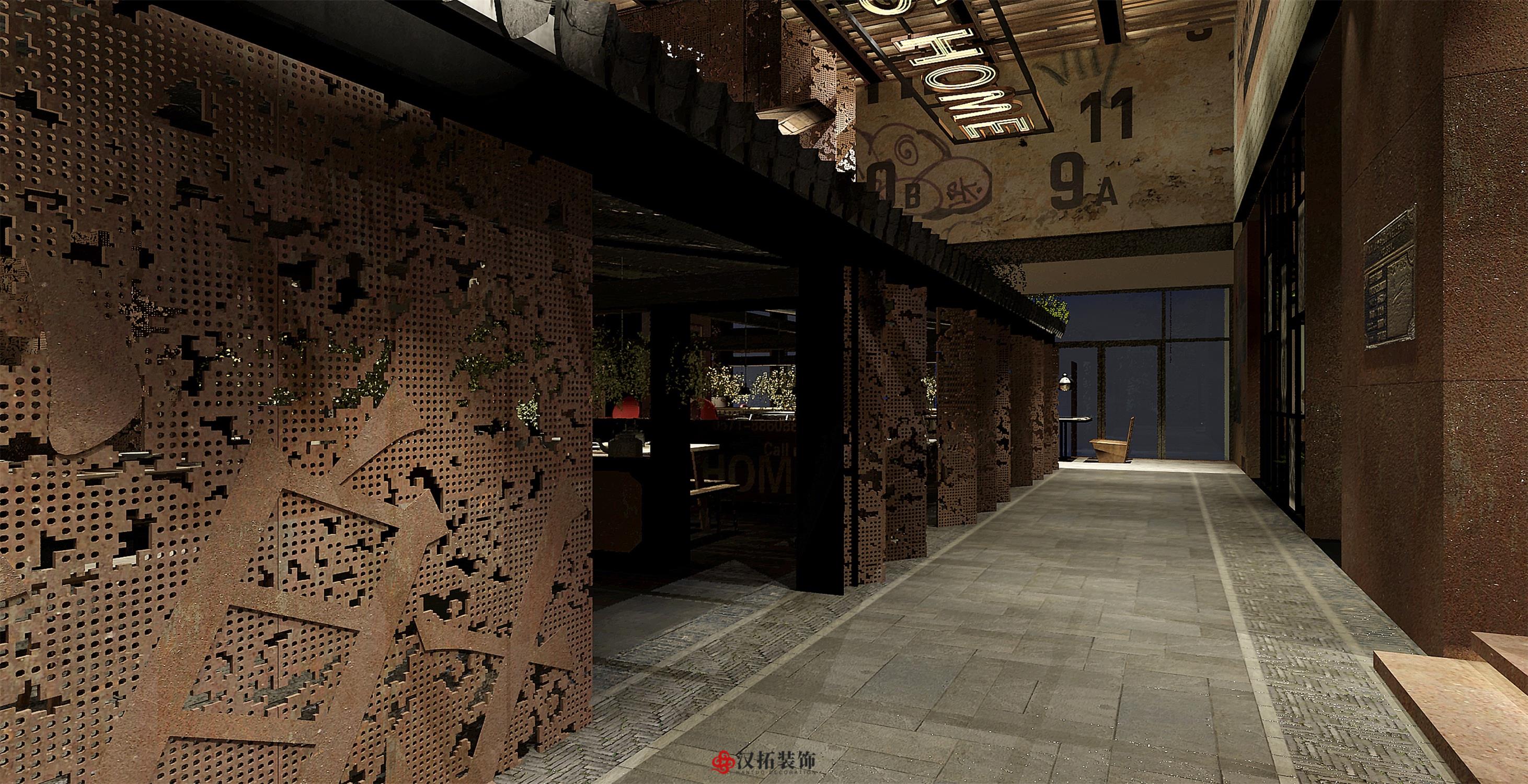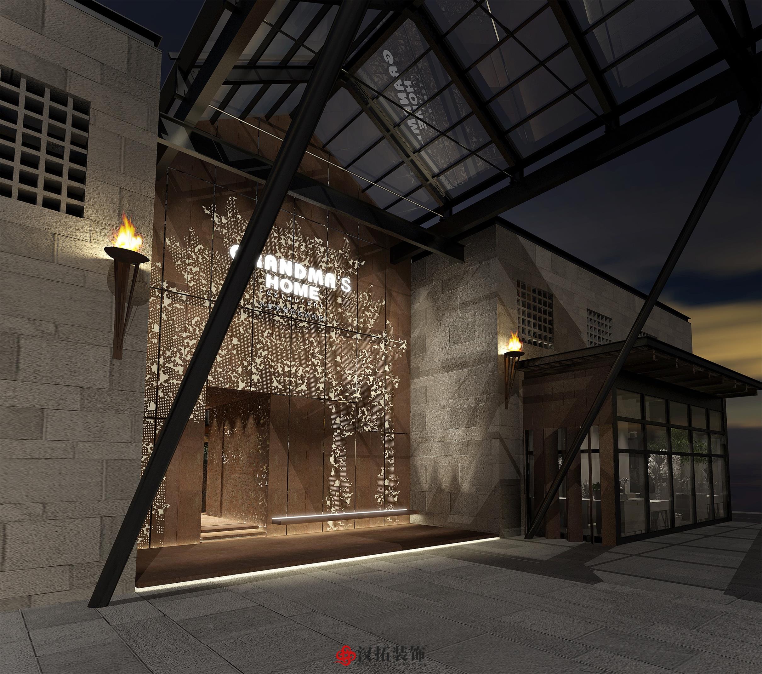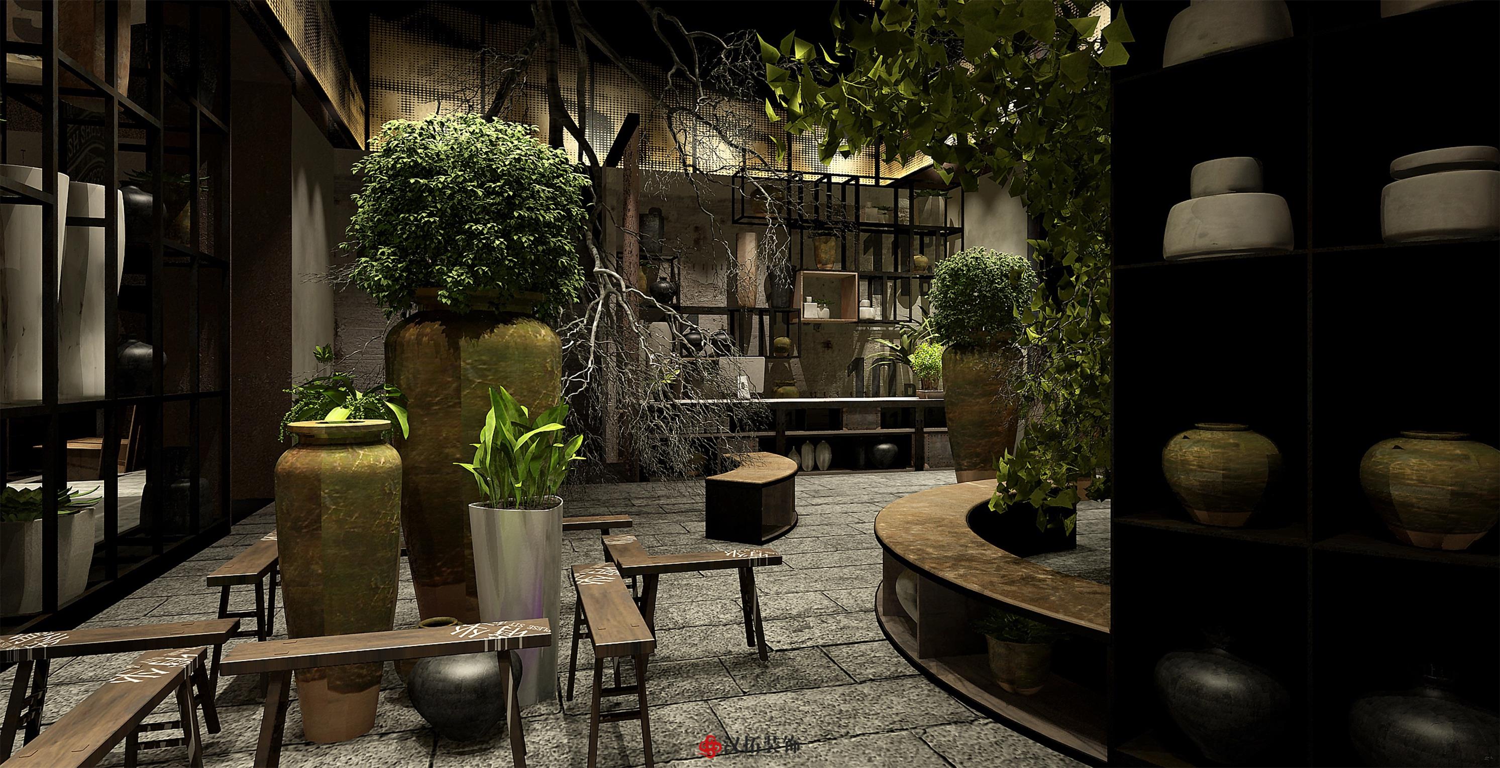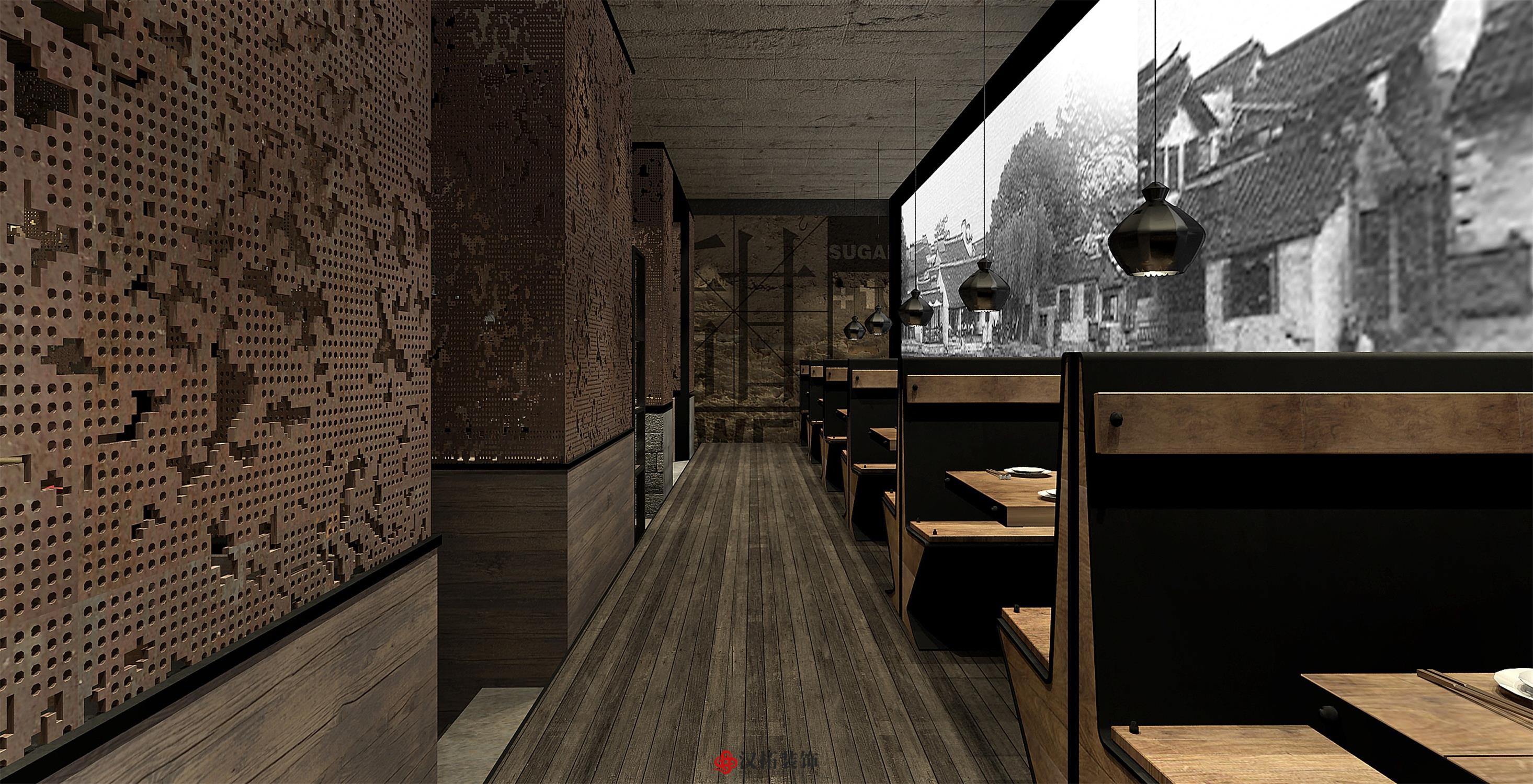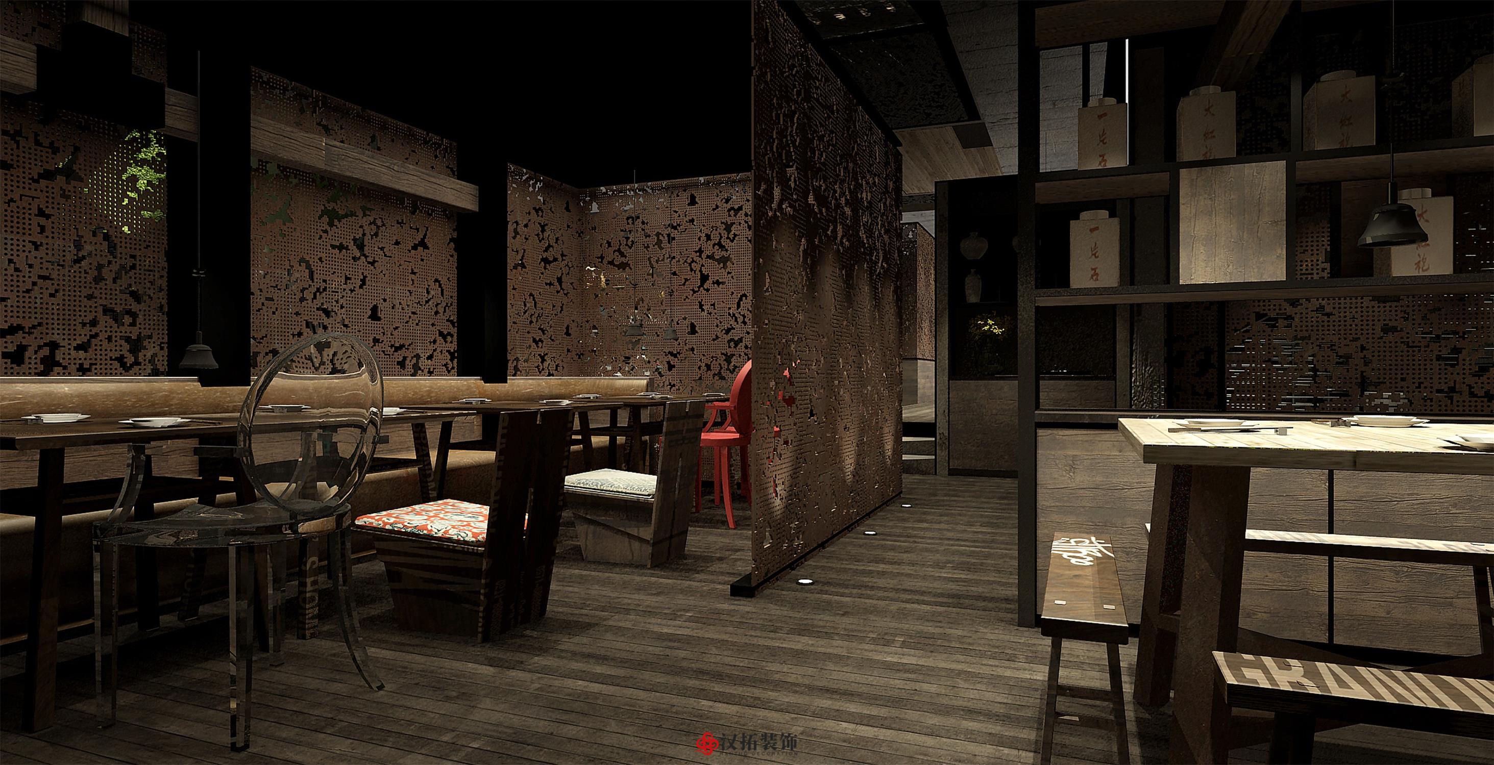 設計說明:以傳統的深色中式古董木桌為中心, 搭配長條板凳、扶手椅和小圓凳,座位周圍留有 充裕的空間以便上菜、敬酒時可自由走動。墻體 材質顏色以淺色為主,使周圍色調呈現出樸素和 溫馨感,地面鋪設深色木地板,配合偏暗的暖色 燈光,將古樸典雅的氣氛烘托出來